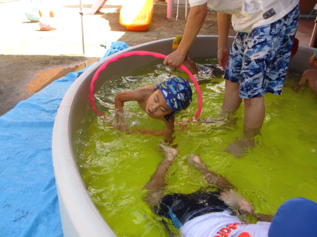 プールでフープ潜りをしました。大きいフープは楽々潜れましたが、低いフープが顔を浸けないと潜れなかったけど全員が出来ていました。