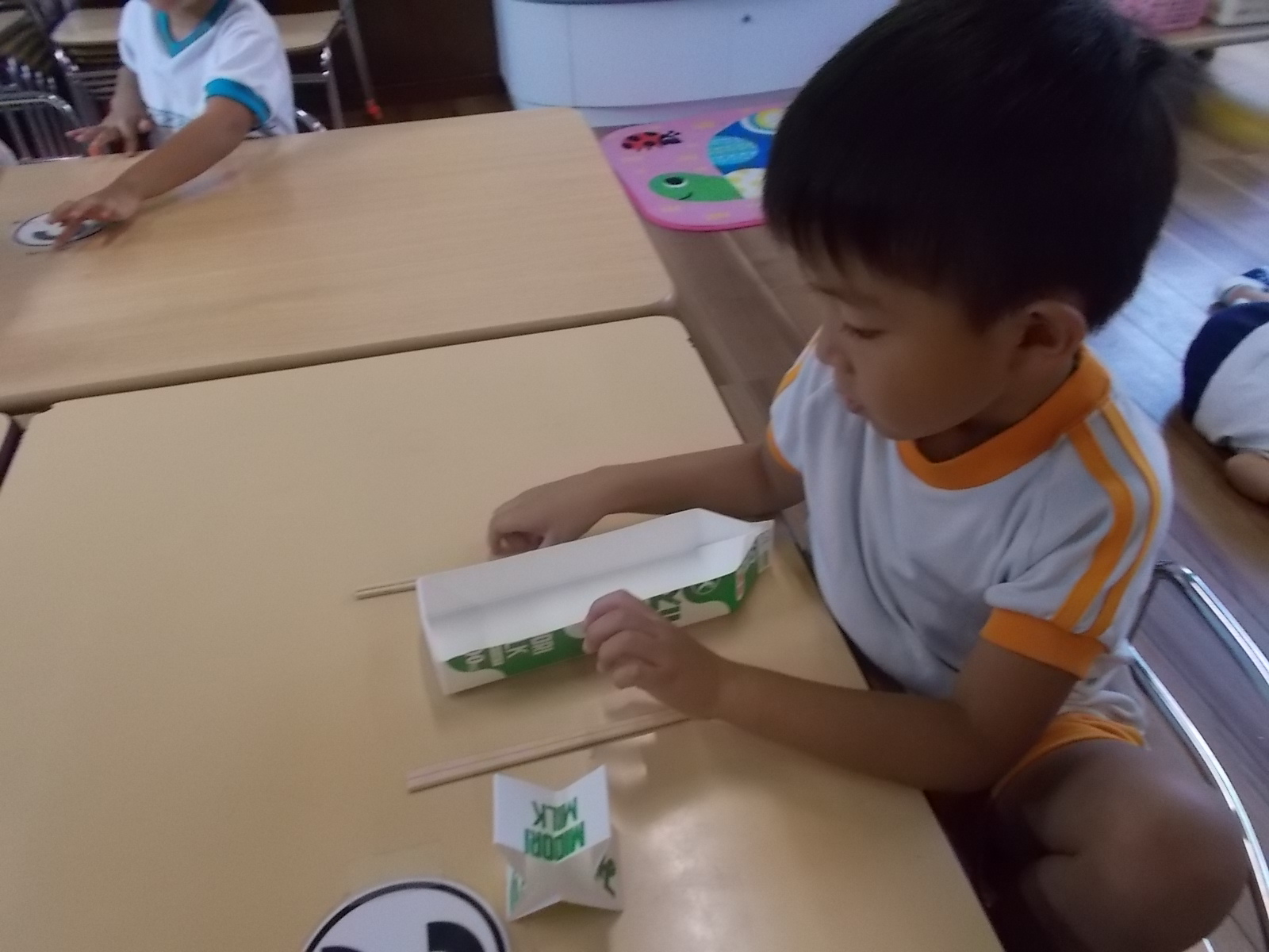 今日ははな・そら保育室で以上児合同保育でした☆ 廃材で、プロペラを回して進む船を作りました^^ 先生が前でやってみせ、その後2人ずつペアになって製作です。ちょっと難しかったので、先生と協力しながら、頑張って完成させました!