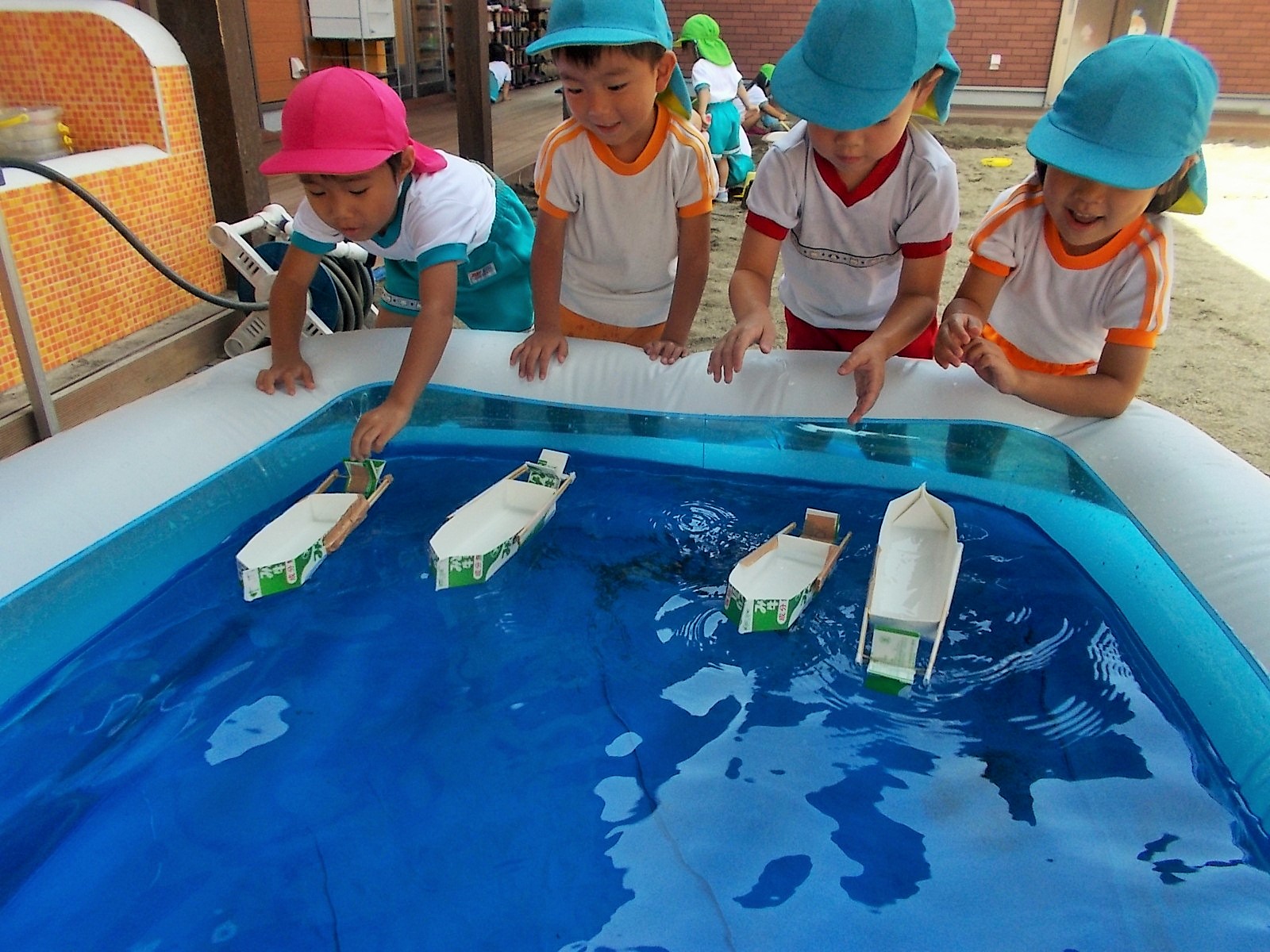 子どもたちも船を進めて遊びました^^ 逆に回して船が後退したり、みんなで競争したり、無理矢理沈めて潜水艦にしたりと、思い思いに楽しんでいましたよ^^