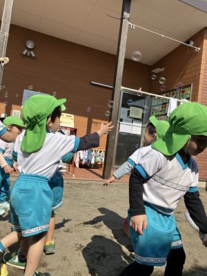今度はシャボン玉を出してみると、追いかけて捕まえようとするお友だちがたくさんいましたよ。