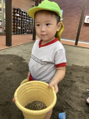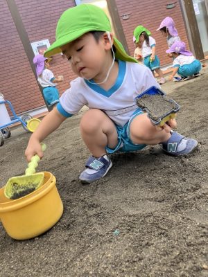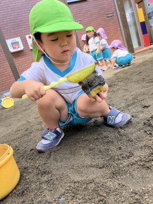 Eくんはバケツに入れた砂を使ってブルドーザーを作っていました(#^^#)