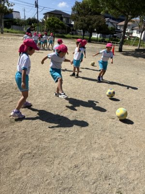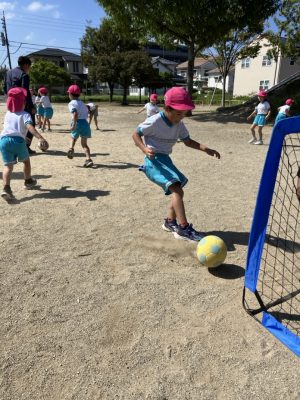 リレーでは黄色チームが勝ちましたが、今日のサッカーではピンクチームが勝利し、子ども達は大喜びでした(^^♪