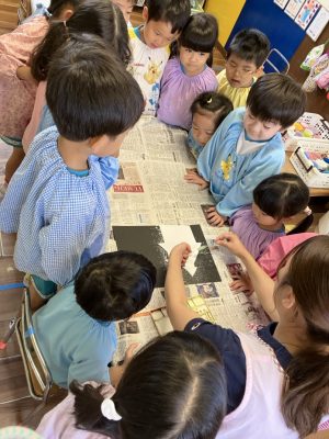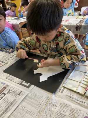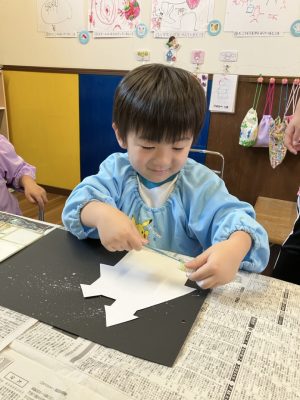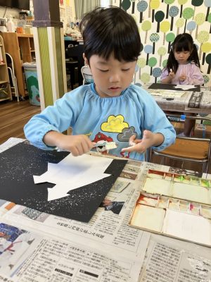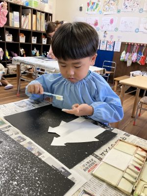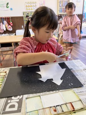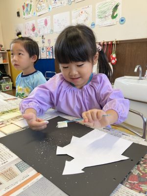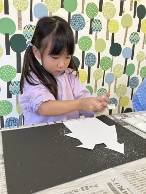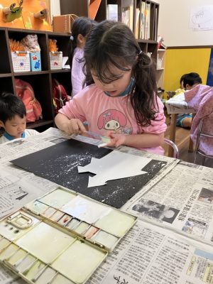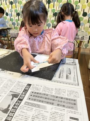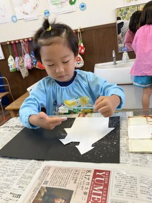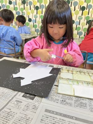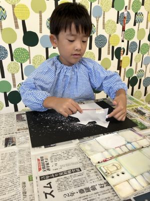 今日はスパッタリングをして顔や髪の毛に絵の具がついているかもしれないので