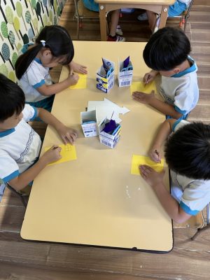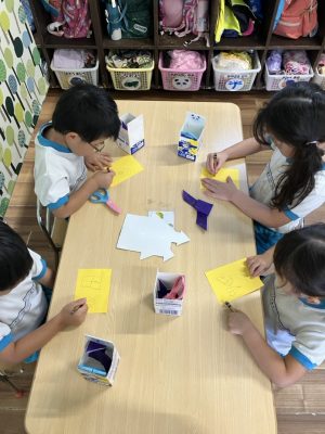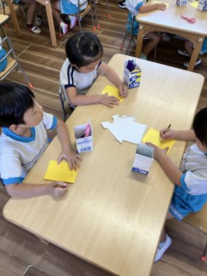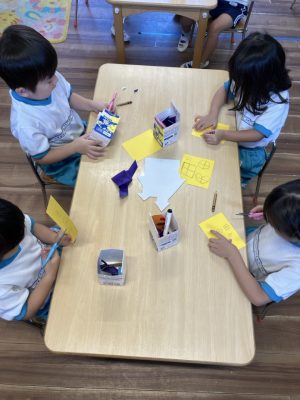 次にお屋敷に飾る窓を作りました。自分たちで四角い窓や三角、ハートの窓など好きに形を書いて