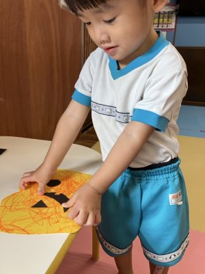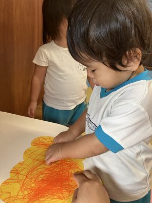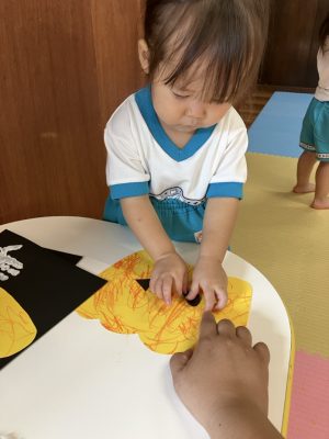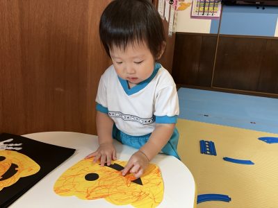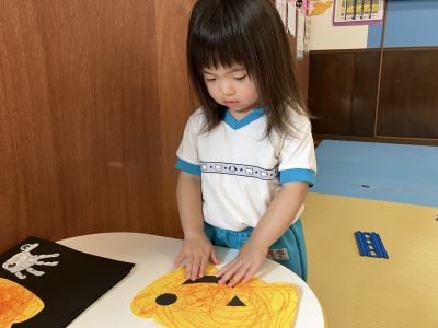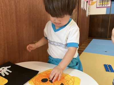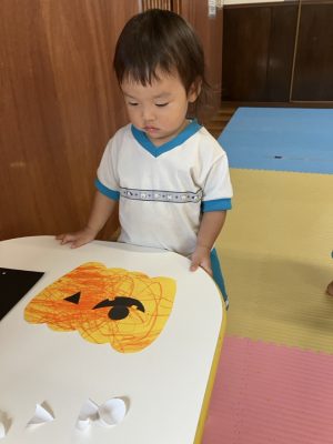 今日は、製作をしているゆきぐみさんです。以前クレヨンや手形をしているものに目や口をつけてハロウィンのお化けを作っていきましたよ