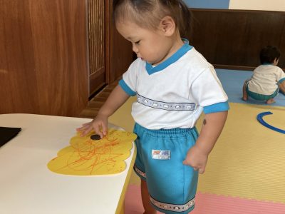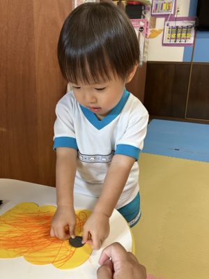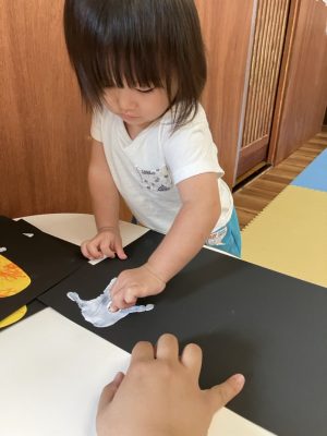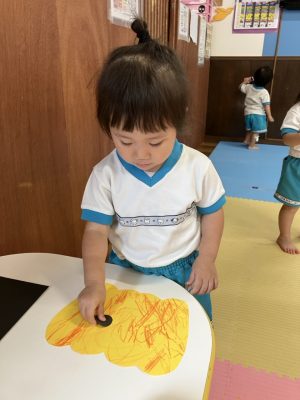 指先を使って目や口のシールを貼るのですが、指にくっついたりとなかなか難しいところがあるのですが、ゆきぐみさんみんな自分たちで貼っていくことが出来てとっても上手ですよ☆