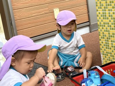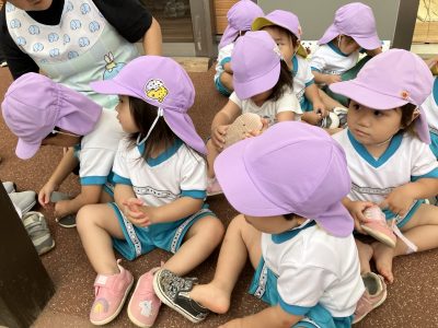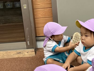 ゆきぐみさんは、今、自分たちで靴を履くことを頑張っています。足がうまく靴に入らなかったり、向きが違っていたりとしても一生懸命な子ども達です。
