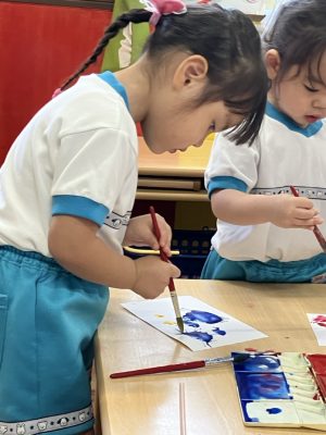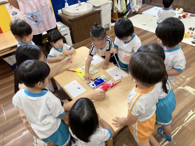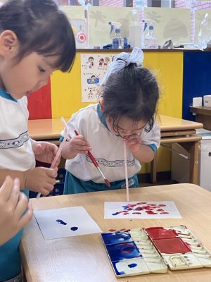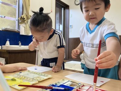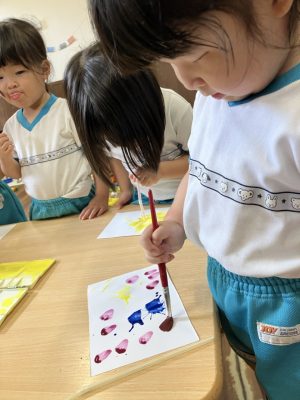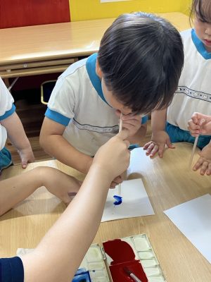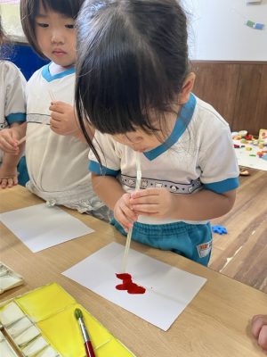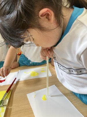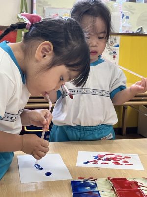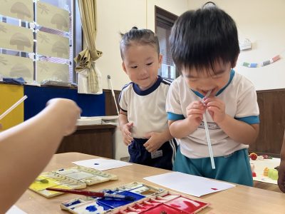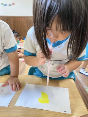 初めてということもあり、なかには画用紙の上で筆で絵具を広げ水分がなくなりストローで吹いても絵の具が広がらず悔しそうにするお友だちもいました(;_:)