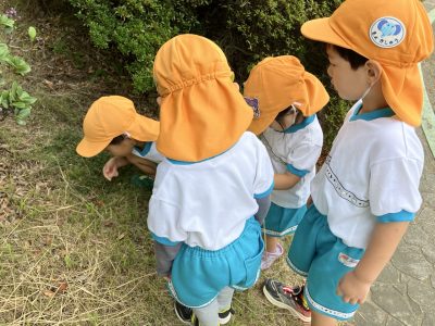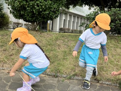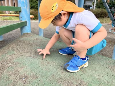 何かを運んでいるアリを見つけて後をついていっているお友だちも(笑)