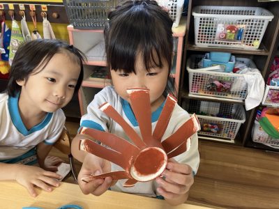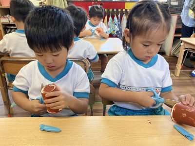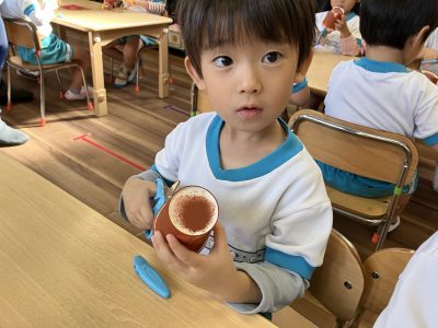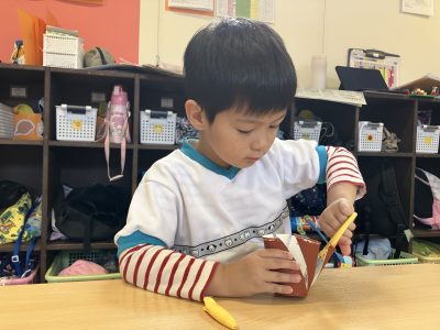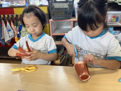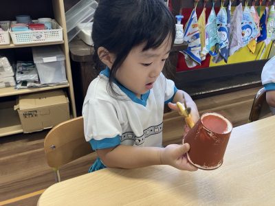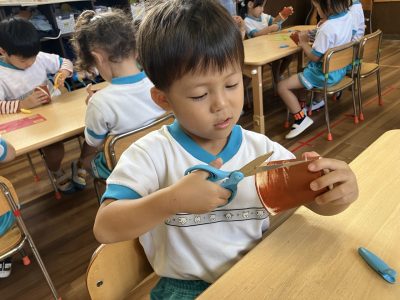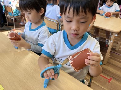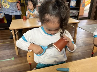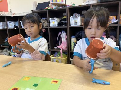 昨日、紙コップにスポンジで絵の具をつけて乾かしておいたので、今日はその紙コップにはさみで切れ込みをいれました。