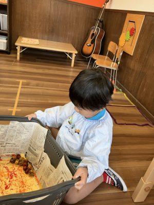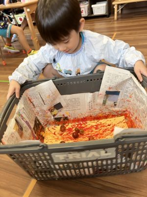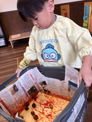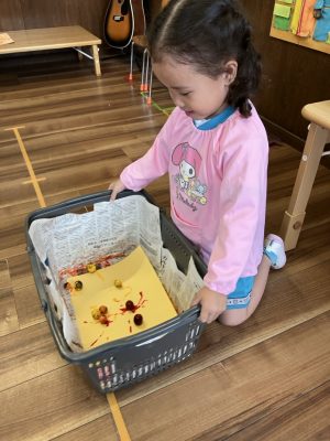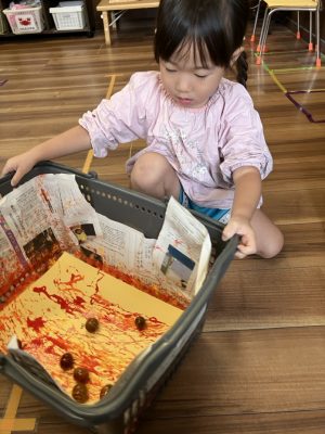 どんぐりに絵の具で色を付けて、歌を歌いながらコロコロ転がして模様を付けました!!