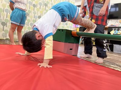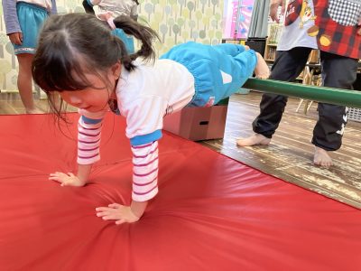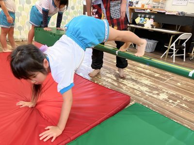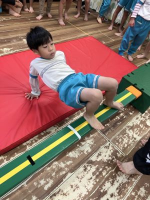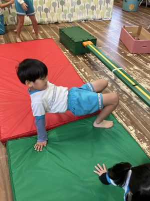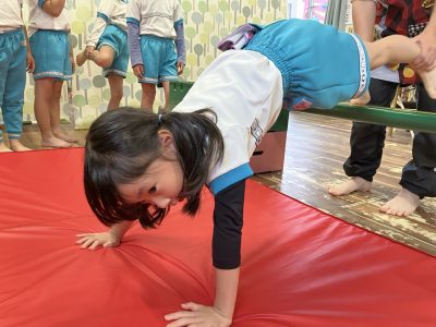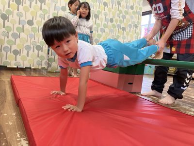 まずはくまさん歩きで足は平均台にのせて横歩きをしていきます!