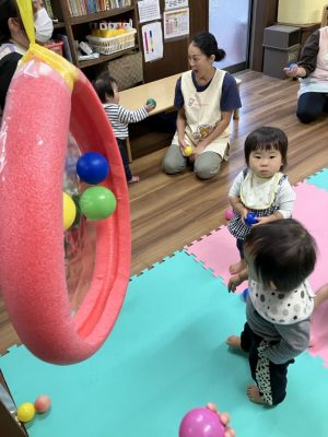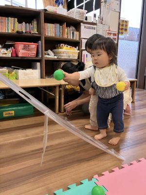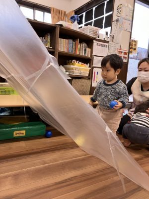 ぶら下げた輪っかにテープをくっつけてみると、興味津々な子どもたち🥰