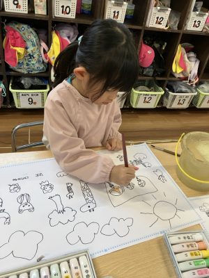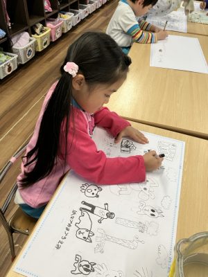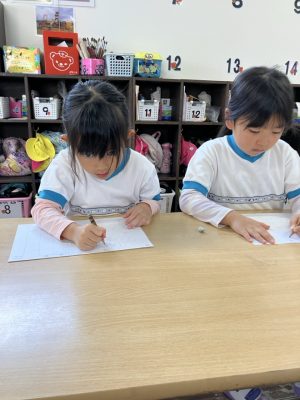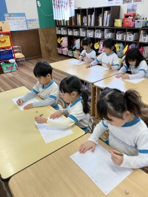 公開保育の運筆ドリルでも見てもらいましたが文字の部屋を意識し、なぞらずにも奇麗に描こうとする子が増えています(^^♪