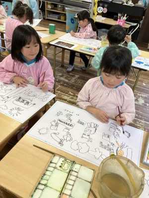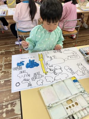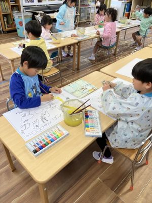 マジックでなぞり書きがすんだ子は絵の具で色塗りを開始しました!!