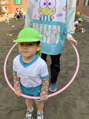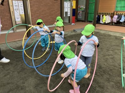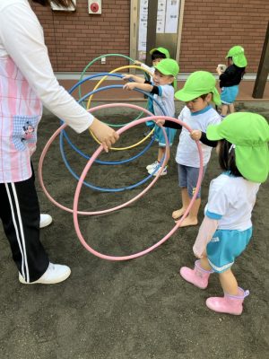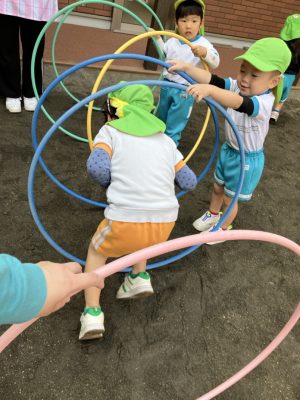 フープのトンネルをみんなで作り、お友だちが通れるようにしてあげるゆめぐみさん♪