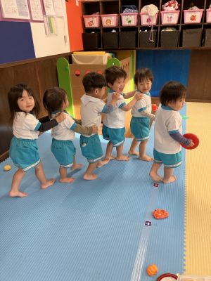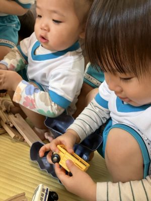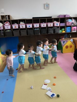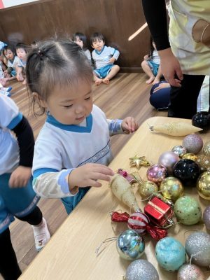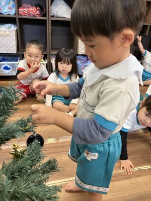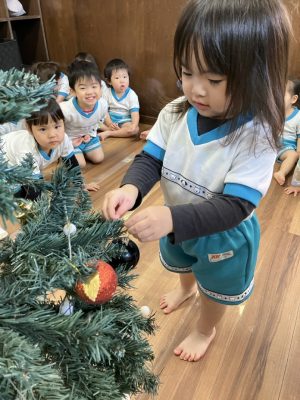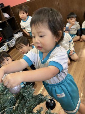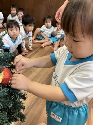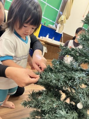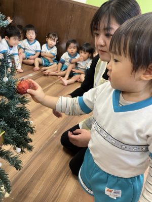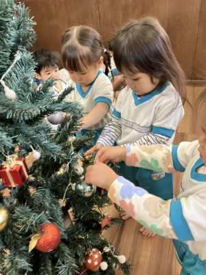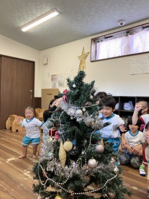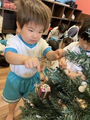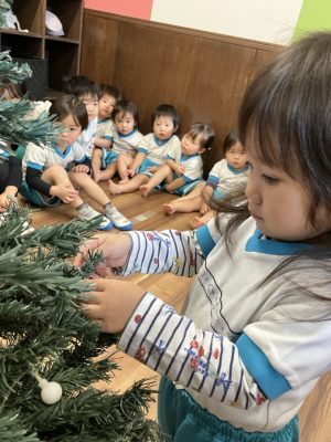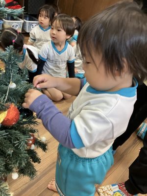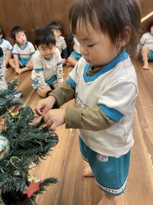 登園後の遊びの時間の様子です♪電車ごっこが始まりました☆彡つきぐみのMちゃんも連結したいとついていっています♩ 今日はゆめぐみさんと一緒にクリスマスツリーの飾りつけをしました。クリスマスソングを流して楽しい雰囲気の中、自分で好きなものを選んで飾っていきました☆彡サンタさんのおはなしをすると目をキラキラさせてお話を聞いてくれていましたよ!かるがもこども園にもサンタさんがきてくれますように!