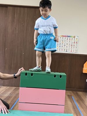 さて、今日はまず巧技台を使って運動遊びをしました。